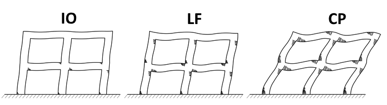 In the performance analysis of existing buildings, three damage cases and damage limits are defined at the section level for ductile elements. These are Limited Damage (IO), Controlled Damage (LF) and Pre-Collapse Damage (CP) states and their limit values. Performance evaluation of existing structures is made according to the damage areas of the sections. Damage zones of critical sections are defined as Limited Damage Zone, Significant Damage Zone , Advanced Damage Zone and Collapse Zone .