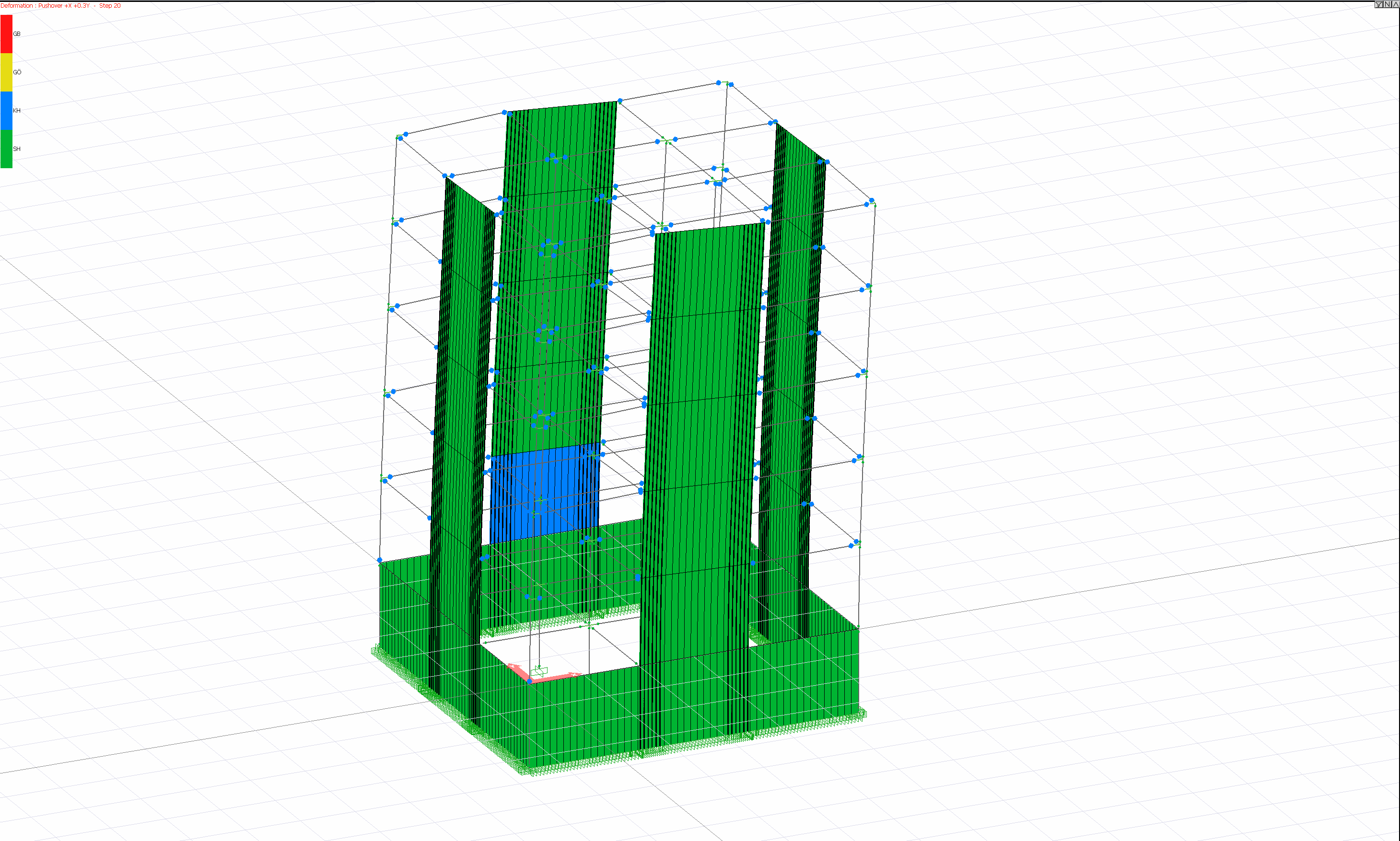 In the picture below, the damage conditions resulting from the distributed plastic behavior model in which the curtains are defined are shown for an example structure. Here , the elements shown in green are calculated in the Limited Damage Zone (IO) and the elements shown in blue are in the Significant Damage Zone (BS) . The elements shown in yellow mean that they are calculated in the Advanced Damage Zone (IH) and the elements in red are calculated in the Failure Zone (SW) .