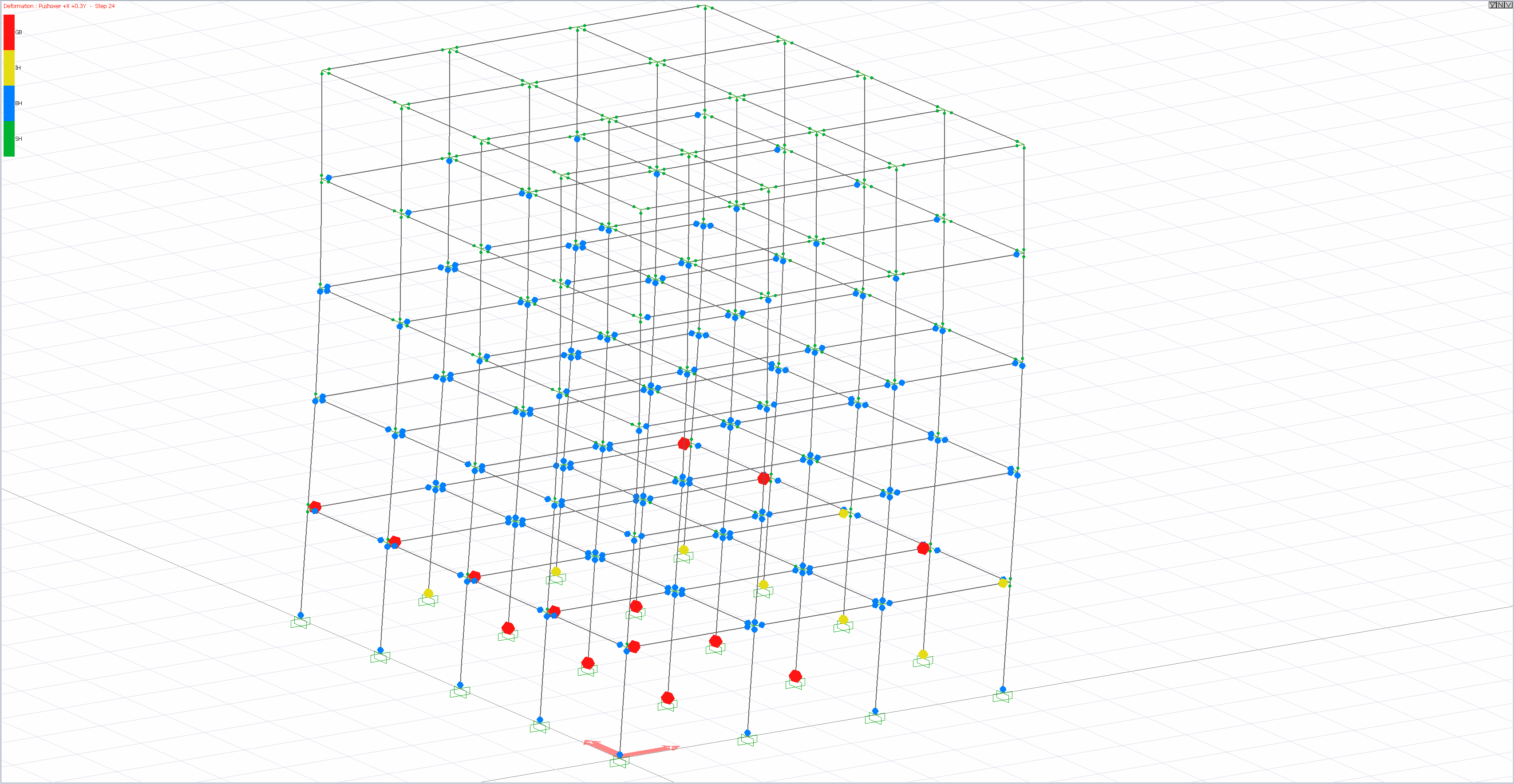In the picture below, the areas where plastic hinges are formed and the damage conditions are shown for an example structure. Here plastic hinges shown in green are in the Limited Damage Zone (IO) , plastic hinges in blue are in the Significant Damage Zone (BH) , plastic hinges in yellow are in the Advanced Damage Zone (IH) and plastic hinges in red are in the Failure Zone Calculated in ( GB) .