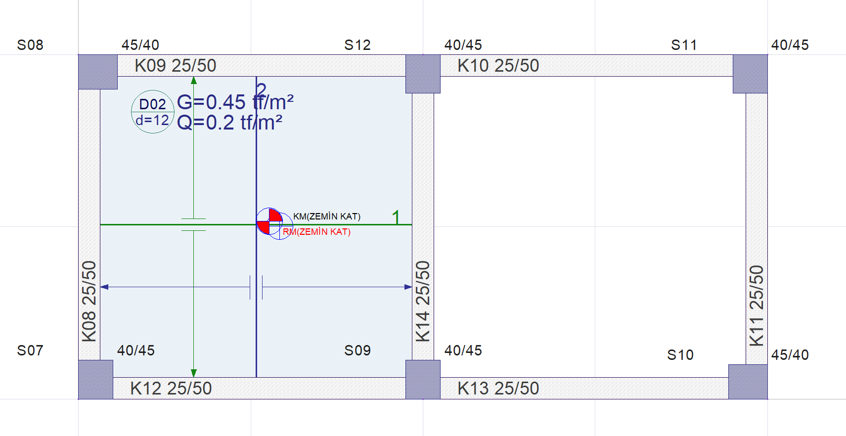 For a reinforced concrete system whose plan plane is given as below, the rigid regions to be defined in the column, beam and slab joints are taken into account in the analysis model. The lengths of rigid zones are automatically determined according to their dimensions.