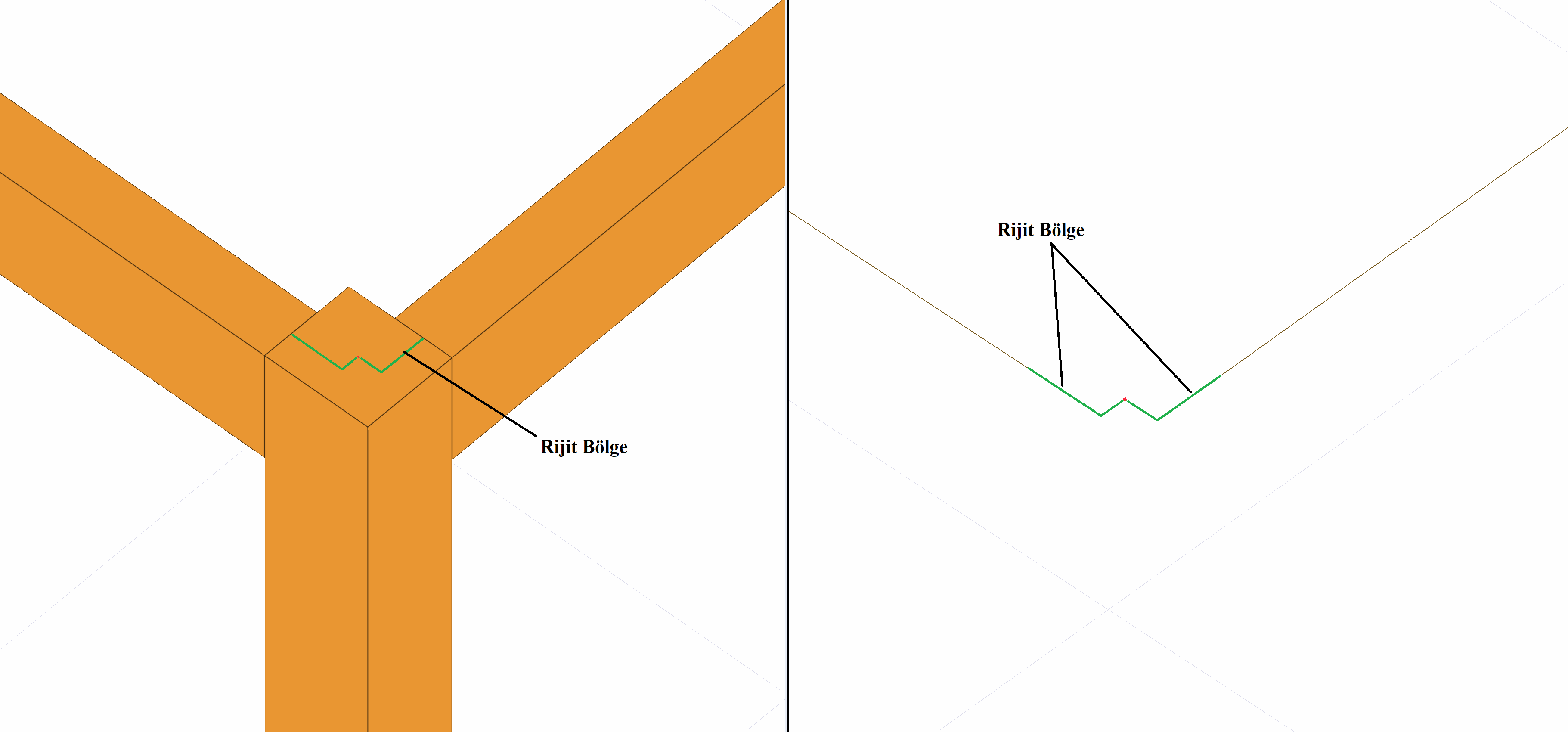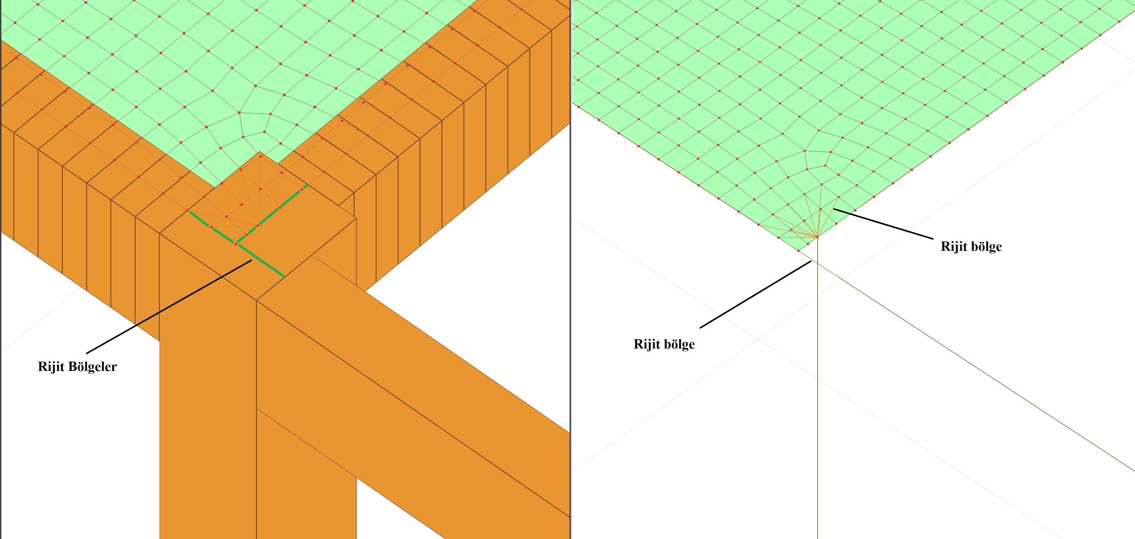 The areas indicated in green in the picture are rigid elements defined due to column-beam junction and can be seen in the analysis model. The red zones are rigid zones defined by the slab-column-beam joint zone. If the slab is not defined, that is, the shell is not a finite element, the analysis model is defined as follows.