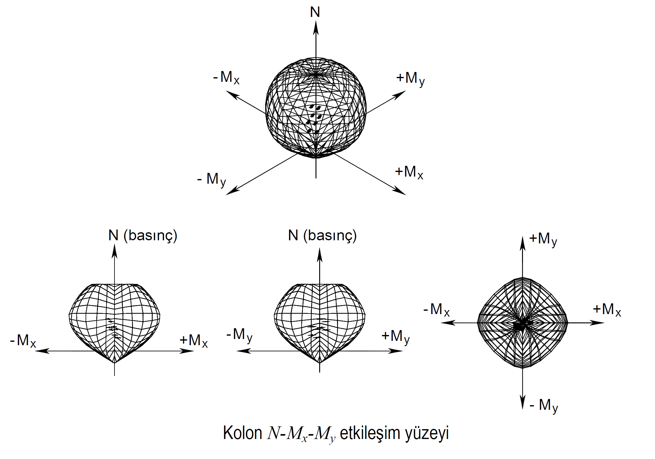 If the earthquake calculation is made with the nonlinear methods specified in TBDY Section 15.6 , the unit deformation and plastic rotation demands are obtained by determining the plastic rotation values of the plastic joints at the element ends . Axial force and biaxial bending interaction are taken into account in the definition of plastic hinges. The following picture shows the yield surfaces for a plastic joint in an existing structure, consisting of axial force and biaxial bending interaction.