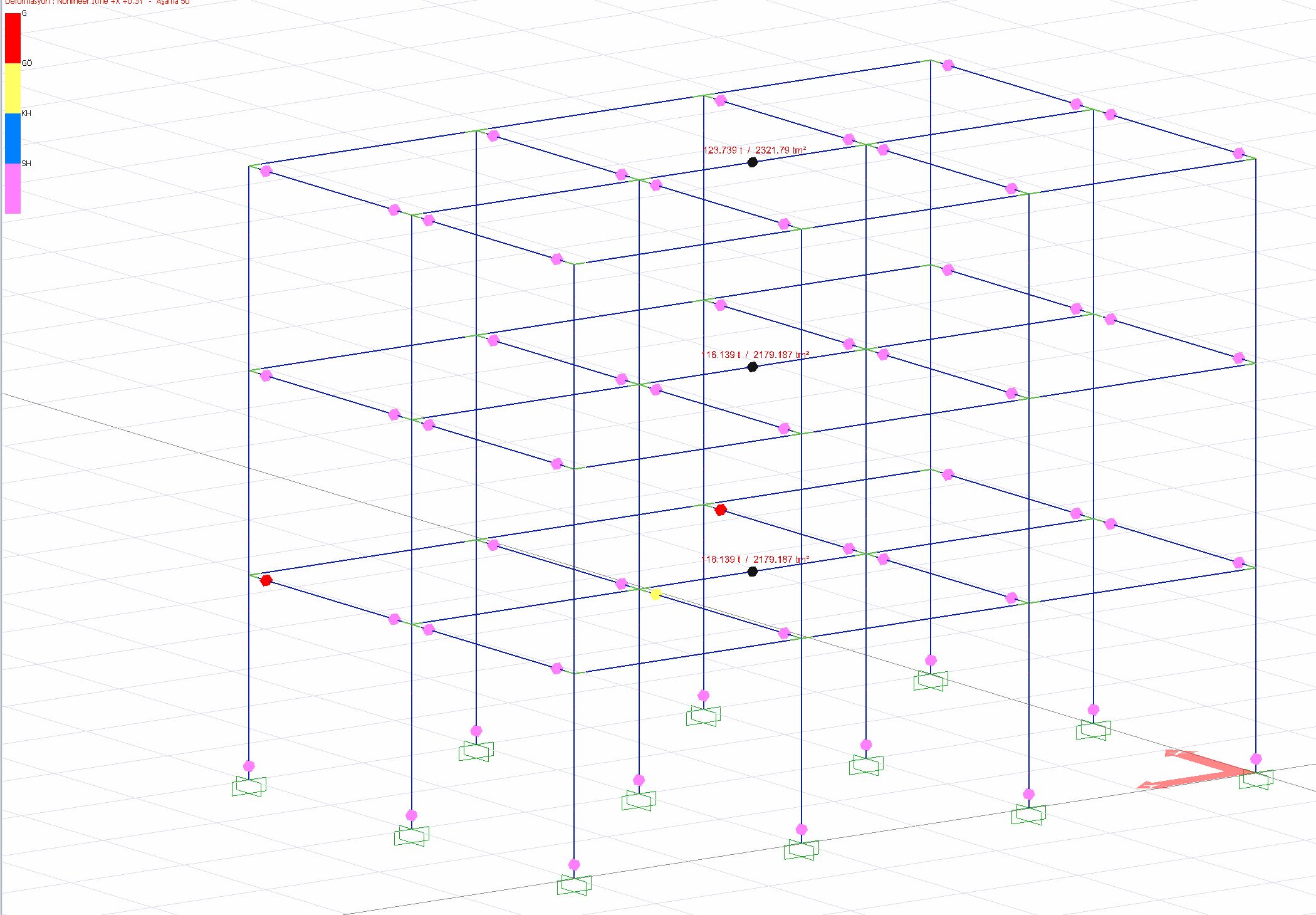 If nonlinear methods are used with the evaluation and design according to deformation (ŞGDT) approach in existing structures, plastic joints are defined in the appropriate places of the rod finite elements defined in the carrier system model. When any cross-section reaches its torque value, the carrier system model is changed and other steps are continued with the new carrier system model. The picture below shows a three-dimensional carrier system consisting of rod finite elements in which plastic hinges are defined.