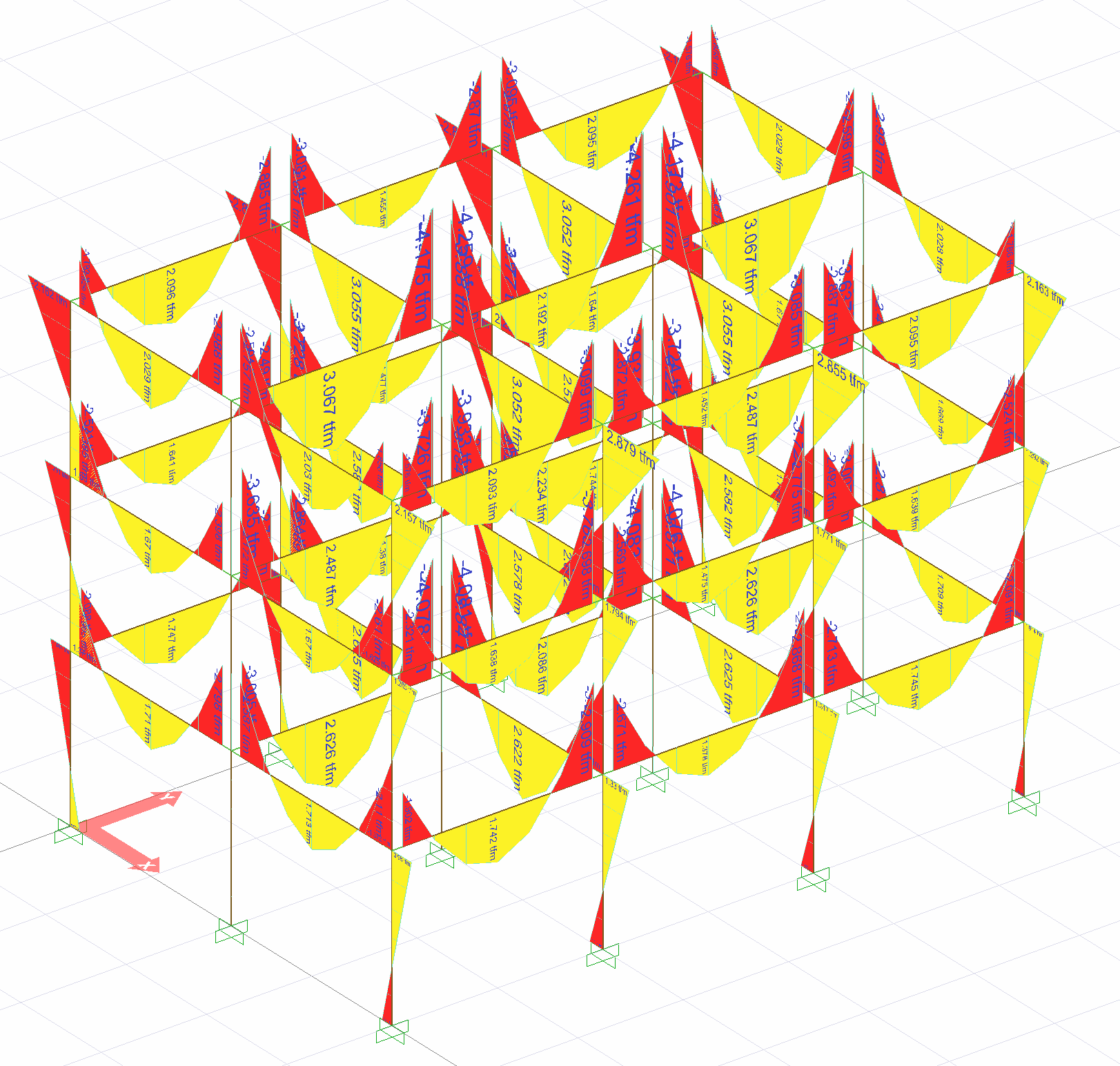 The load-bearing system model of existing buildings is created by using rod finite element in column and beam elements, and shell finite element in slab and curtain elements. Beams and columns are modeled in three dimensions, taking into account all six degrees of freedom, three translational and three rotational freedoms. In rod finite elements, there are six internal forces corresponding to all six degrees of freedom. These internal forces are the axial force defined according to the local axis of the bar, and the shear forces V2, V3 and the torsion moment and the bending moments M2, M3. The 6 internal forces, 6 node displacement and deformation values obtained as a result of three dimensional analysis are calculated. (Element Local Axes)