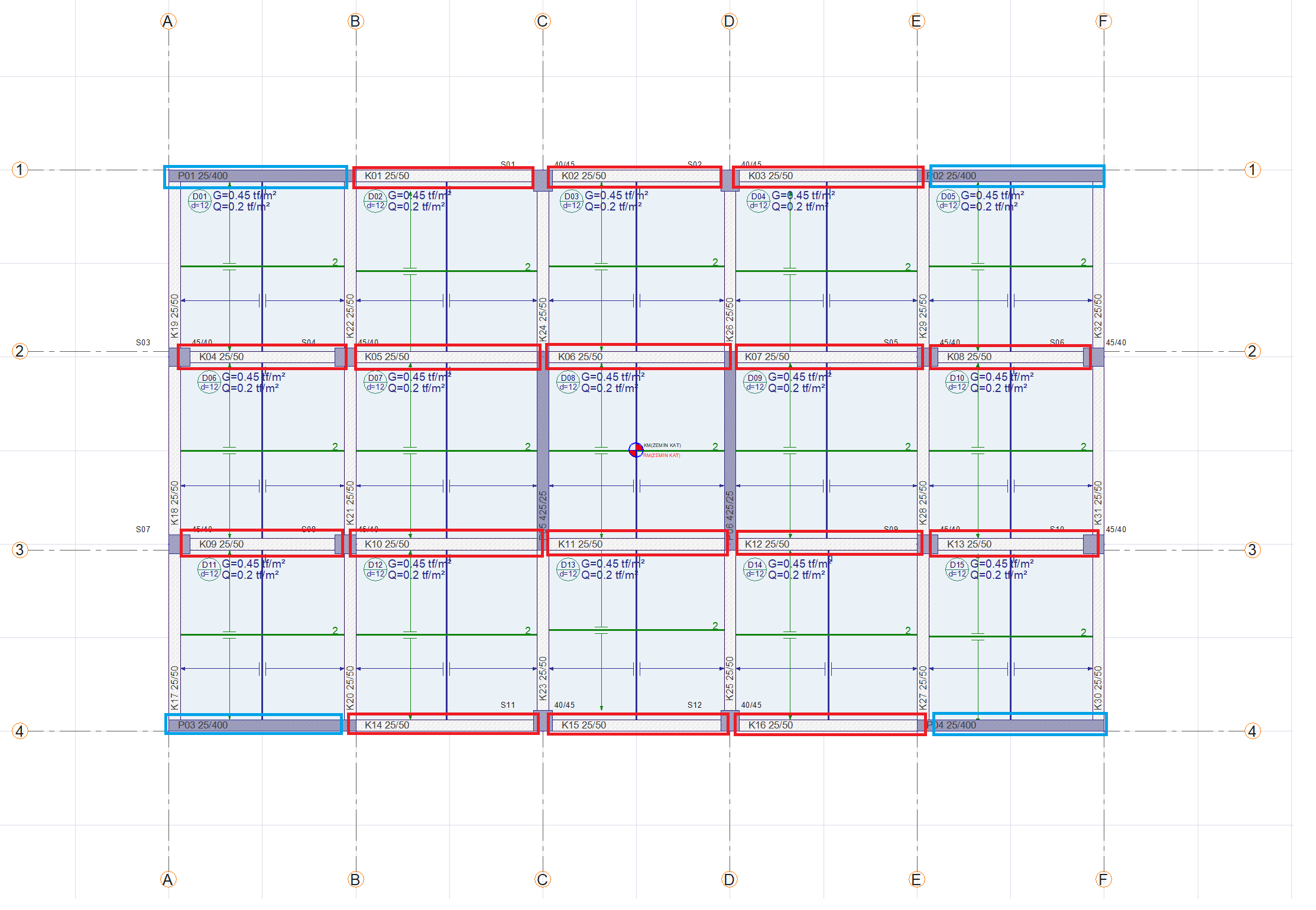 In the picture above (X) the beams with average ECO values for the earthquake direction are marked in red. (X) For the earthquake direction, the average ECO values of the beams marked in red are compared with the ECO values scaled by the shear force of the vertical ductile elements. While calculating the ECO value scaled by the shear force of the walls (X), the curtains marked in blue are taken into consideration for the earthquake direction. While the ECO value scaled by the shear force of the columns is found (X), the internal force values in this direction for the earthquake direction are divided by the capacities in the earthquake direction (X).