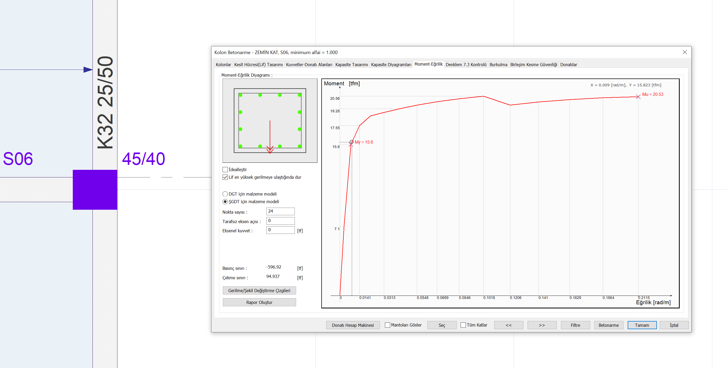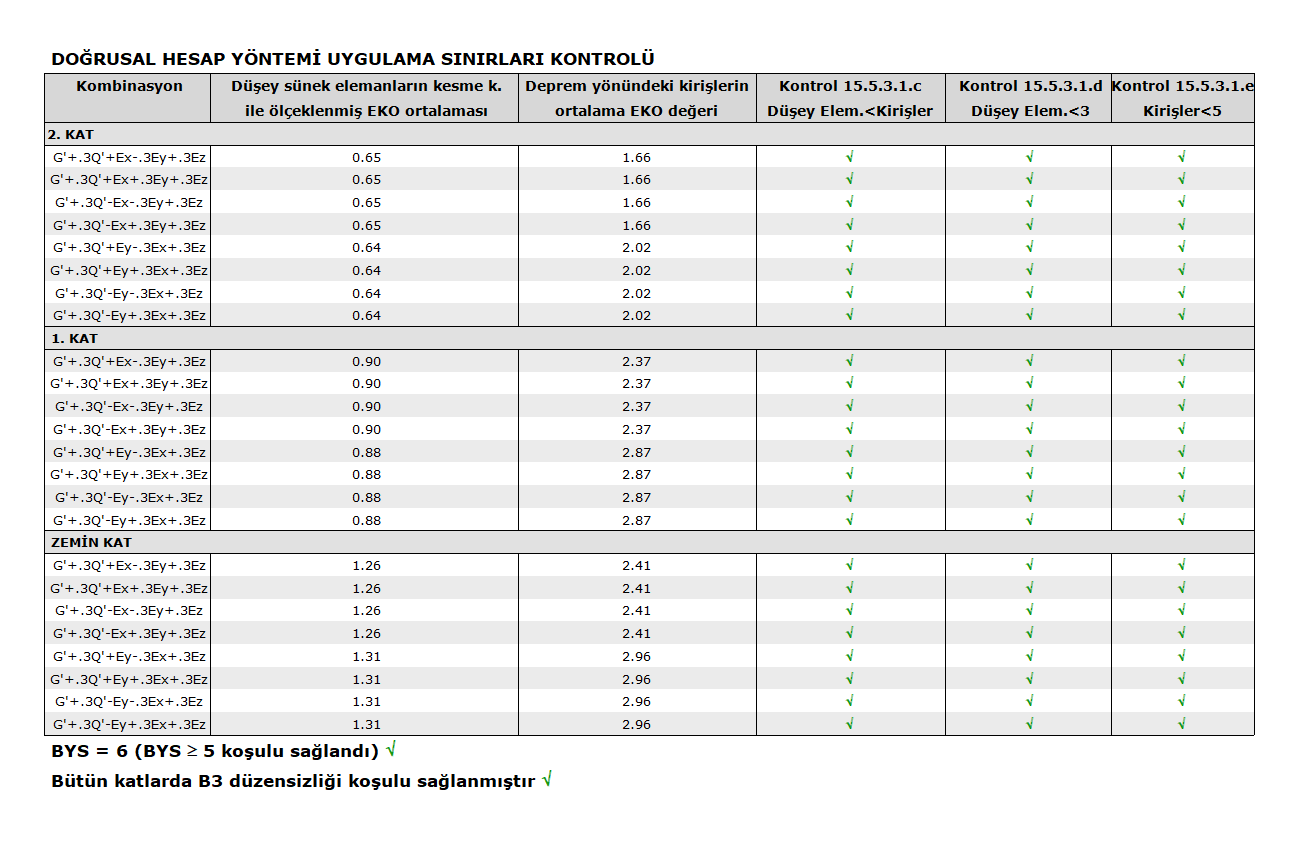 The ECO value is the ratio of the internal force value consisting of vertical loads and earthquake loads ( loading conditions ) taken as R a = 1 to the cross-sectional capacity calculated by considering the Knowledge Level Coefficient and Available Material Strengths . Therefore, ECO values depend on the reinforcement placement of the sections, material strength and internal strength value. In order for the ECO value used in the control of the application limits of linear calculation methods to be calculated correctly, the reinforcement placement, material strength and information level coefficient of the existing structure must be selected correctly. An example of TBDY 15.5.3.1 Linear Calculation Method Application Limits Control report is shown in the sample report below.