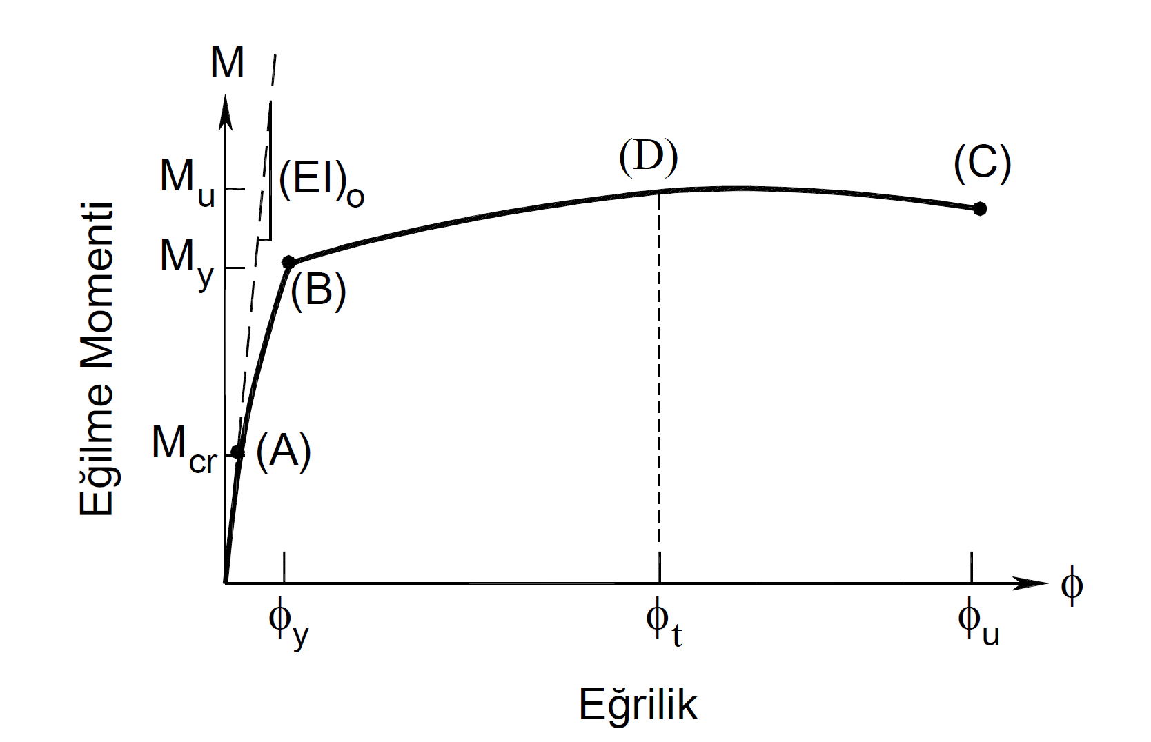After calculating the element end curvature demand ϕ t , the unit deformation demands can be calculated in all unwound and unwound concrete and reinforcement fibers (fiber) in the section. The figure below shows a sample moment curvature plot. In this graph, point (B) is the point where the reinforcement reaches the yield stress. Moment value at point (B) found as a result of the moment-curvature analysis is named as flow moment M y , and curvature is named as flow curvature ϕ y . After this point, plastic deformations occur in the cross section. Point (C) is the failure point of the section and the moment at this point is the failure moment or moment capacity M u , and the curvature is the pre-collapse curvature ϕ u.is called. After this point, the cross section loses its load carrying capacity and plastic deformation capability and collapses. When the linear calculation method is applied in the performance analysis, since there is no plastic joint definition, these values are reached with Equation (15.2) . Therefore, moment-curvature analysis should be used indirectly. The element end curvature demand ϕ t , found by Equation (15.2) , is replaced in the moment curvature graph, and the material unit deformation values at this point are obtained. The curvature demand in the moment curvature graph is shown as point (D).