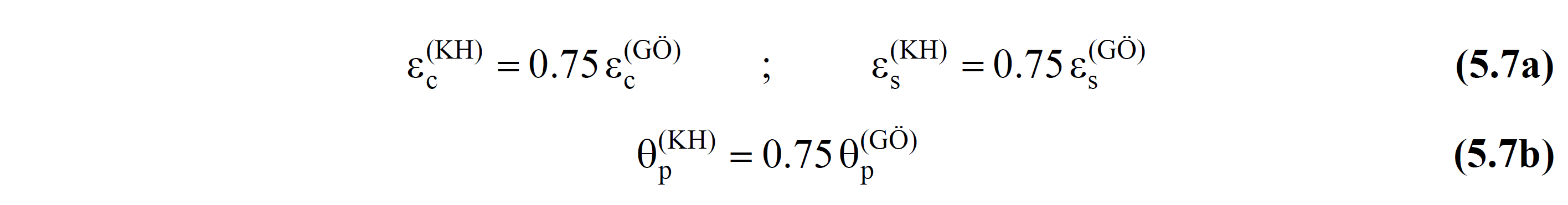 For the Controlled Damage (KH) Performance Level according to TBDY Article 5.8.1.3 , the unit deformation limit value ε c (KH) of the concrete material and the unit deformation limit value don s (KH) of the reinforcement steel is calculated by Equation (5.7a) . For the same performance level, the limit value θ p (KH) of plastic rotations calculated according to the Piled plastic behavior model is calculated by Equation (5.7b) .