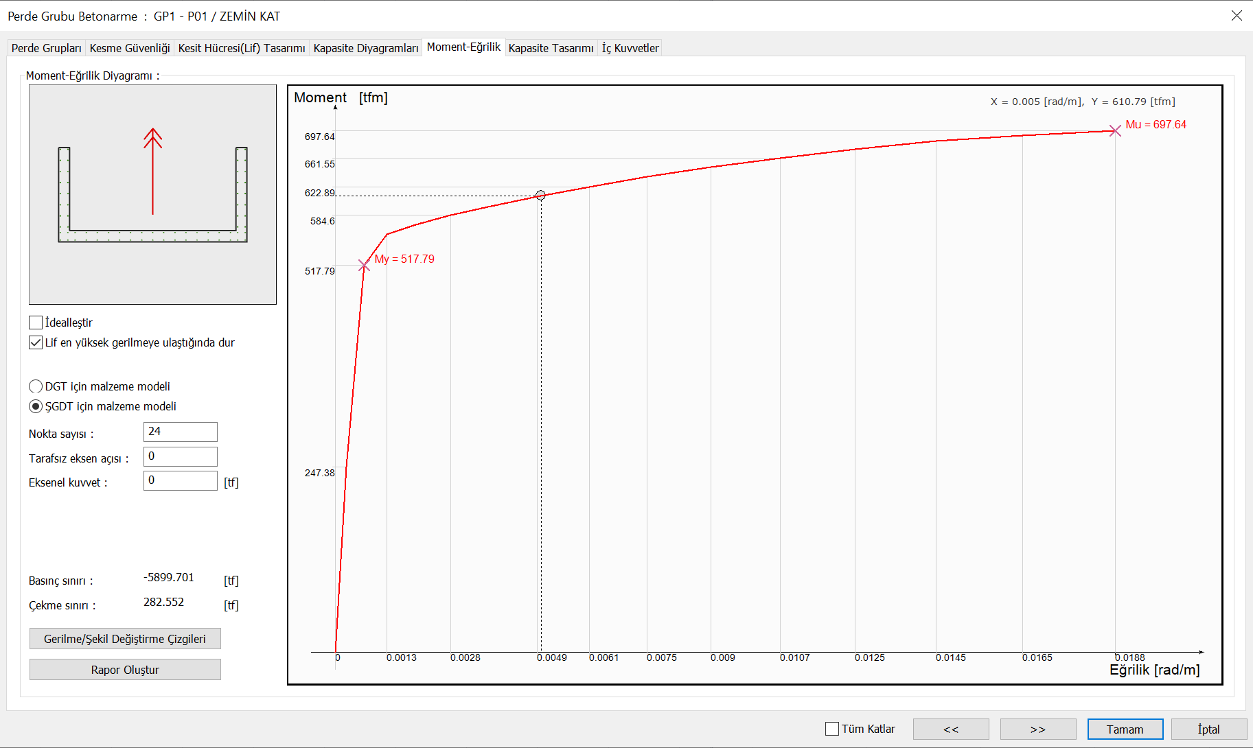 Yield rotation value for shear walls is calculated according to TBDY 15A.4 using the moment-curvature relation for linear performance analysis . Moment-curvature analysis is done by considering the information level coefficient and the existing material strengths.