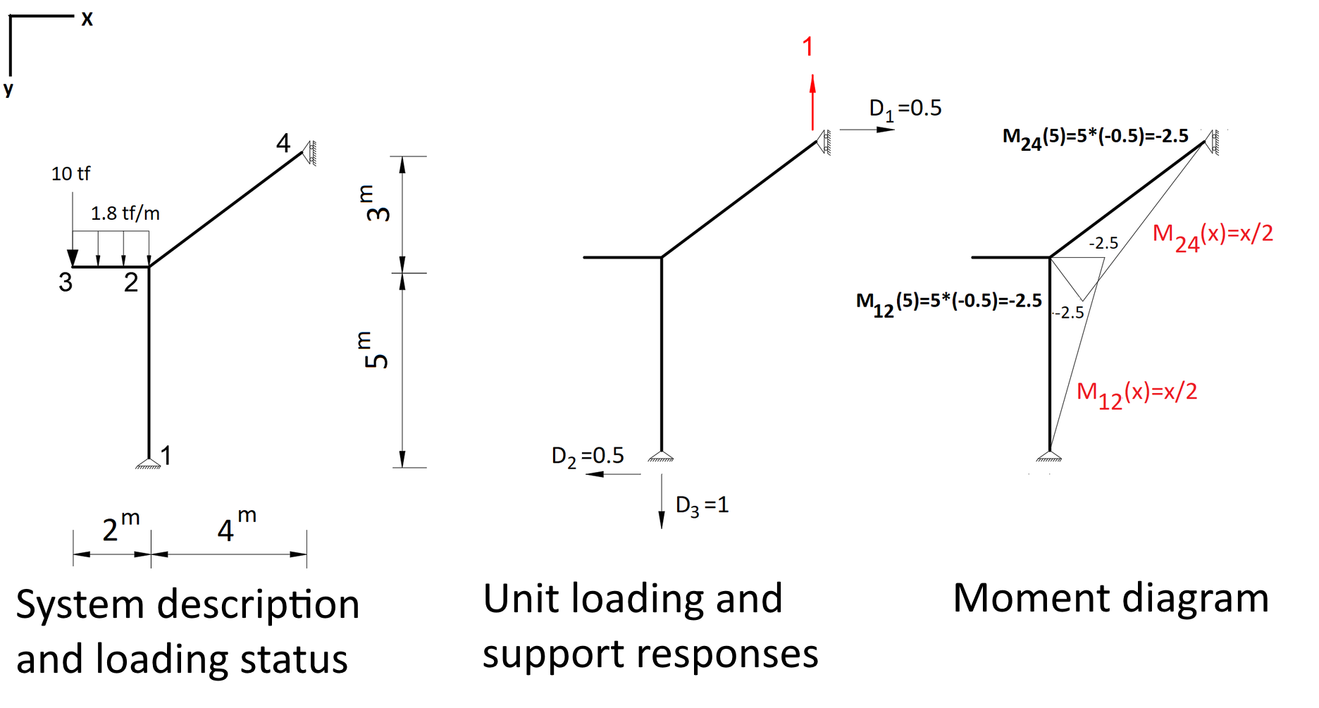 E= Modulus of elasticity A= Cross-sectional area I= Cross-section moment of inertia M= Moment on the element due to external loading M'= Moment on the element due to unit loading Δ= Deformation