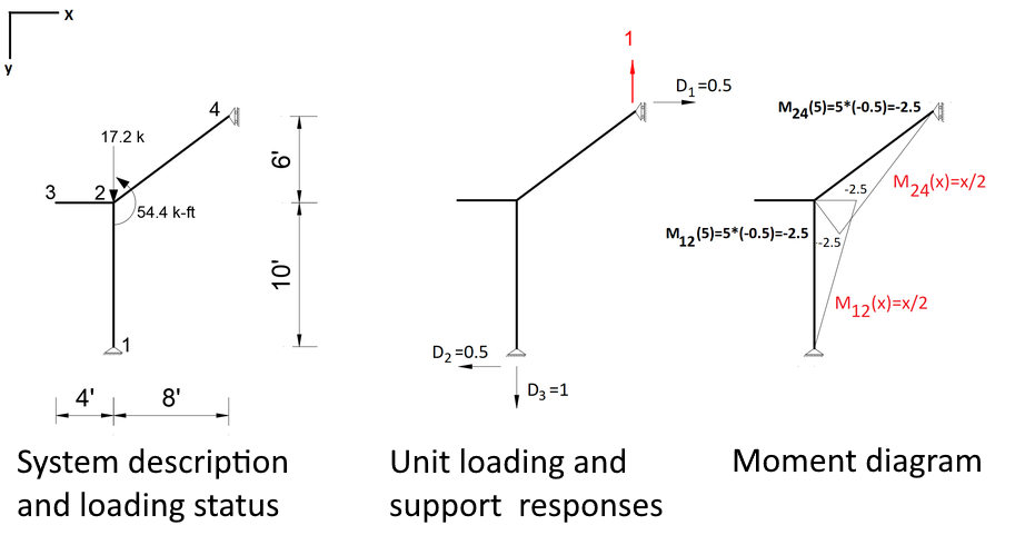 E= Modulus of elasticity A= Cross-sectional area I= Cross-section moment of inertia M= Moment on the element due to external loading M'= Moment on the element due to unit loading Δ= Deformation