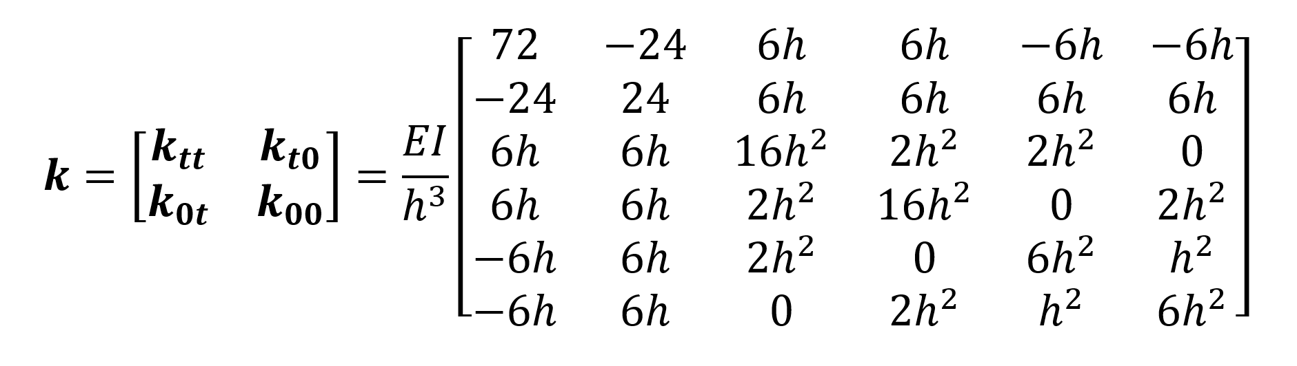 The translational stiffness value of an element with both ends of it is given below. In the figure below, the force required for u = 1 unit of translation is expressed as 12EI / L 3 .