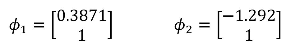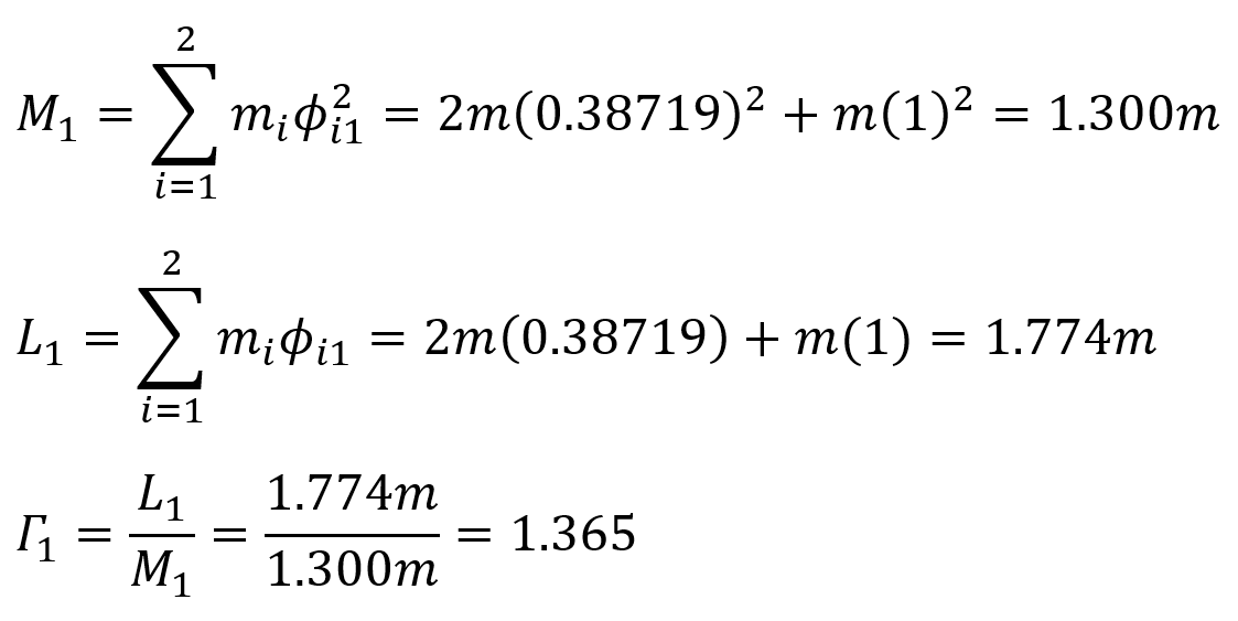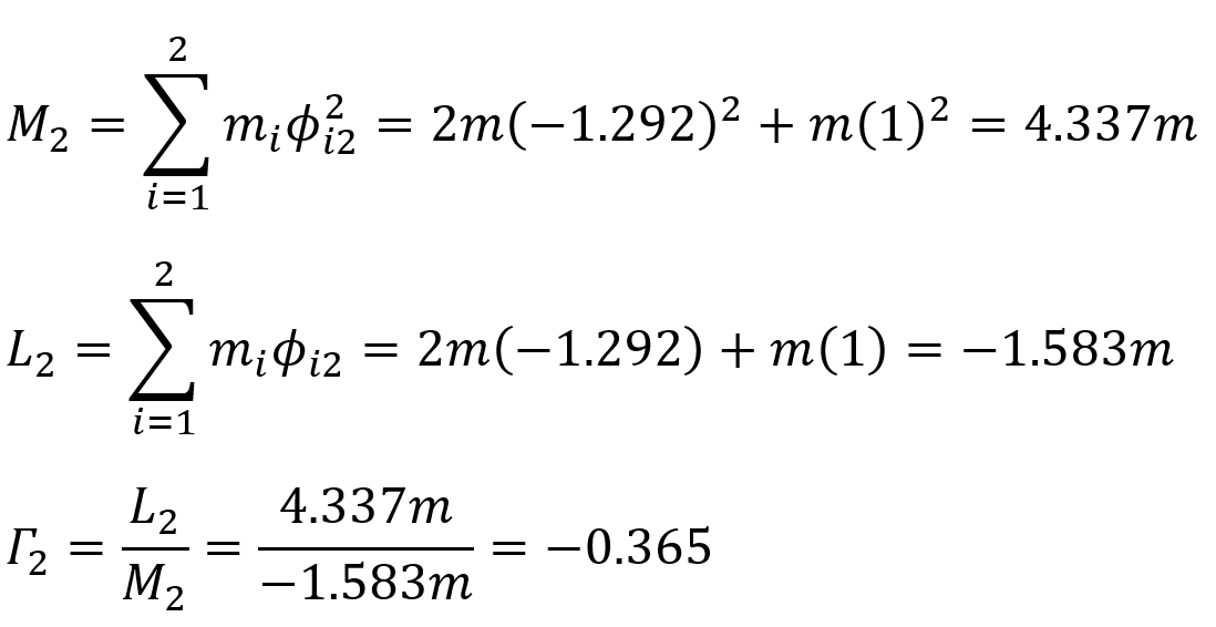 The mode shapes ϕ 1 and mod 2 appear as 2x1 matrices. However, due to the nature of the Eigen vector solution, the equation det ( k ' -w 2 m ) = 0 is a first-order linear dependent equation. Therefore, mode vectors can be expressed as ratios of each other. One element of the mode vectors is given the unit value 1 and the other element is found. In this way, the ratio of mode shapes to each other is determined.