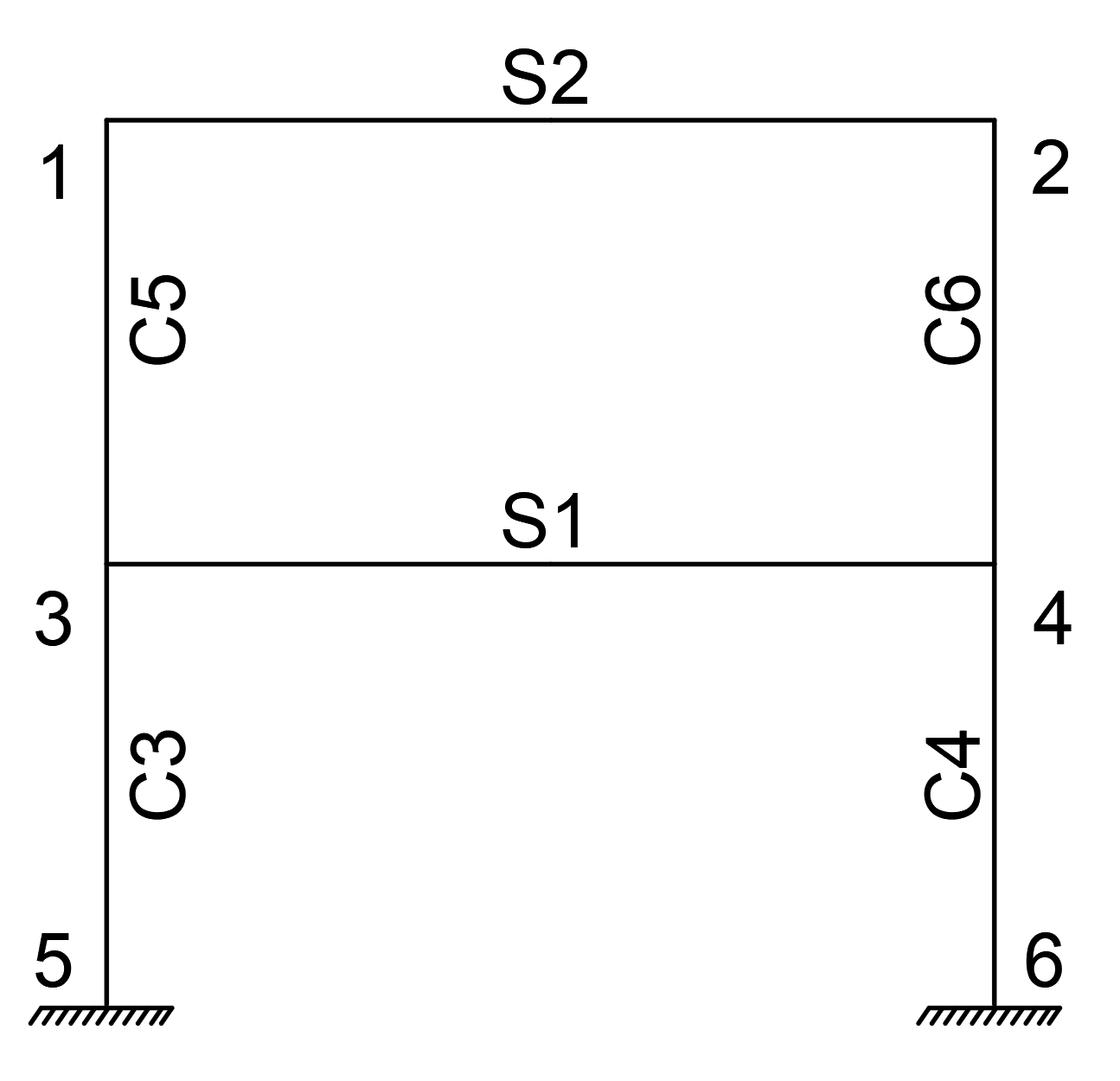 There are 6 nodes in the system below. Joints 5 and 6 of these joints are connected with the built-in support. Since the strain deformations in the system are also neglected, each joint point can move in the UX direction and the RZ direction. Since the strain deformations are neglected, joints 1-2 and joints 3-4 will make the same change in the UX direction. Considering these conditions, there are 6 freedoms in total. For this reason, the total stiffness matrix of the structure is found in 6x6 dimensions.