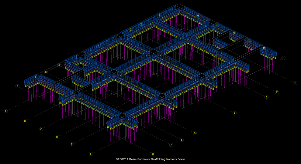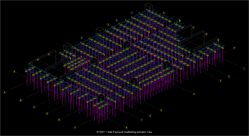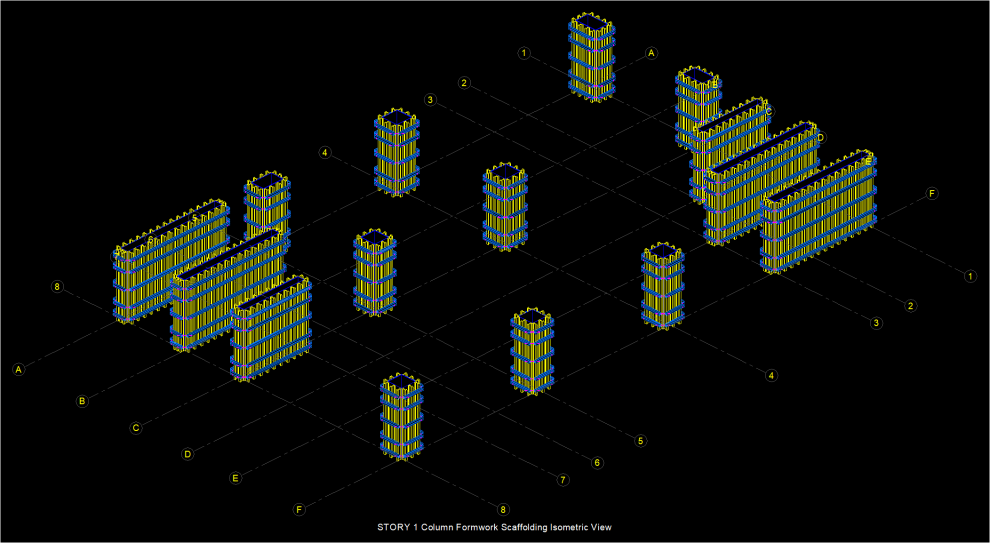 3D isometric drawings of columns/walls, beams and slabs of the formwork scaffolding of the active story will be created.