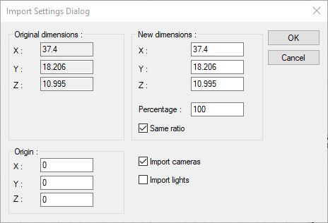 Same ratio ![]() When checked, when any of the x, y, z values in the "New Dimensions" section of the imported file is changed, the other dimensions are changed at the same rate. |