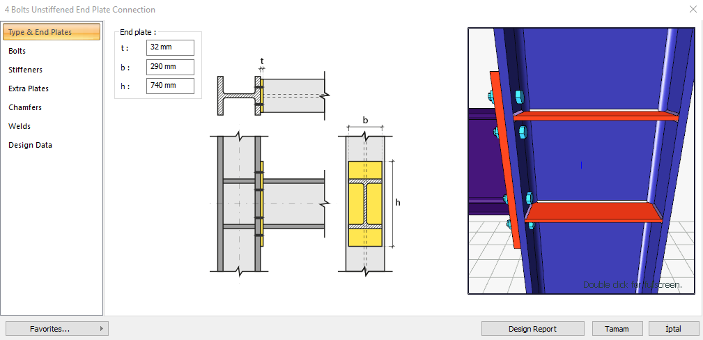 4 bolt unstiffened end plate connection is a moment-resisting connection (rigid connection) that is connected to the columns' flange to the beams. Bolt control, weld control, plate control and connection application limits control are performed automatically according to the placement of the elements of the connection. 4 bolt unstiffened end plate connection is made automatically according to the Design, Calculation and Construction Principles of Steel Structures (ÇYTHYEDY) or AISC 360-16 regulations and the connection report is generated. Connection detail application limits are checked according to TBDY Table 9B.1.