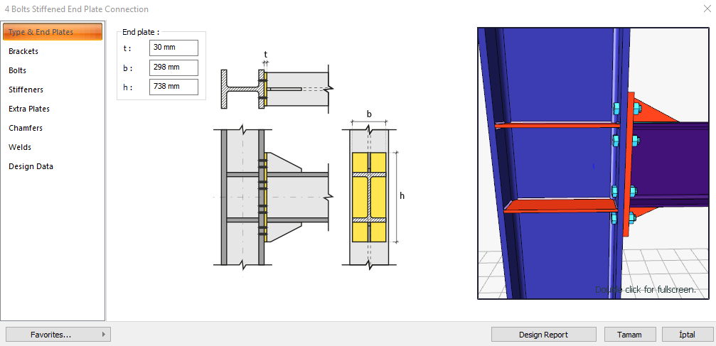 The 4 Bolts Stiffened End Plate Connection is a type of moment-transmitting connection (rigid connection) which is bolted to the columns and welded to the beam and is a stiffening plate. Bolt control, weld control, plate control and connection application limits control are performed automatically according to the placement of the elements of the connection. The 4 Bolts Stiffened End Plate Connection Design is made automatically according to the Design, Calculation and Construction Principles of Steel Structures (ÇYTHYEDY) or AISC 360-16 regulations and the connection report is created. Connection detail application limits are checked according to TBDY Table 9B.1.