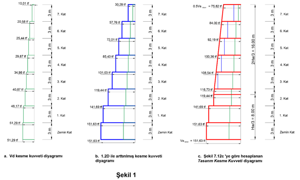 In Figure 1a , the shear force, V d , under the combined effect of vertical loads and earthquake loads under the combination of G '+ Q'-O-0.3Ex + 0.3Ez is shown with green lines.
