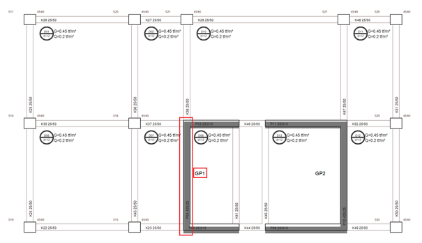 The design shear force values of the P04 curtain arm belonging to the wall group named GP1 of the 8-storey building, whose plan image is given below and each floor height is 3m, will be calculated under the combination of G '+ Q'-Ey-0.3Ex + 0.3Ez loading. Since the structure is a curtain frame system with high ductility level in the X direction, it is considered as R = 8 and D = 2.5 in this direction, and R = 7 and D = 2.5 because it is a shear frame system with high ductility level in the Y direction.