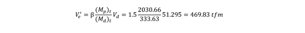 The values of V d and (M d ) t shown in TBDY Equation 7.16 are the shear force and bending moment values calculated under the combined effect of vertical loads and earthquake loads, respectively, multiplied by the load coefficients. In this case , V d and (M d ) t for the loading combination G '+ Q'-O-0.3Ex + 0.3Ez ; V d = (-1.013) + (-0.229) - (41.930) - 0.3 × (26.663) + 0.3 × (-0.445) = -51.295 tf (M d ) t = (66.383) + (17.210) - (361.138) - 0.3 × (211.389) + 0.3 × (29.173) = -333.63 tfm .