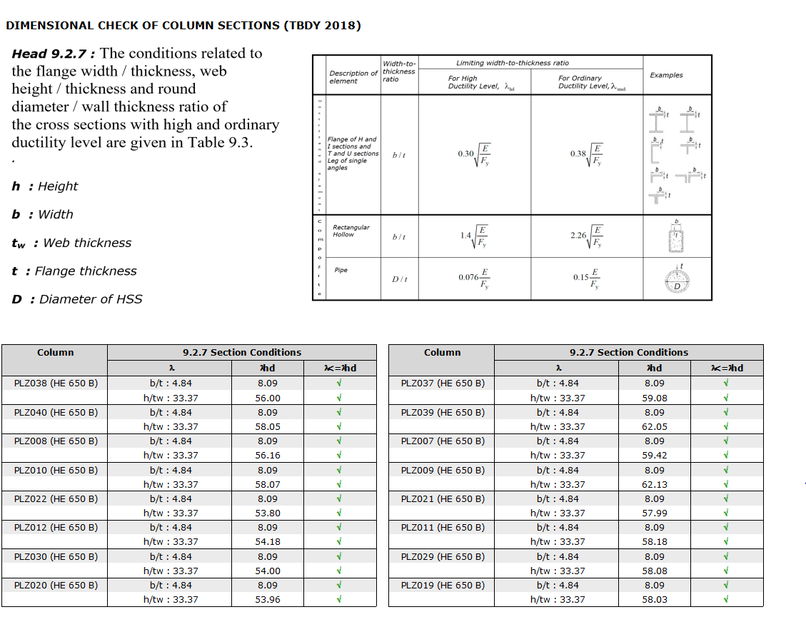 Cross-sections of steel columns and beams, which are frame members with high ductility level, are checked according to Table 9.3 and are included in the relevant reports.