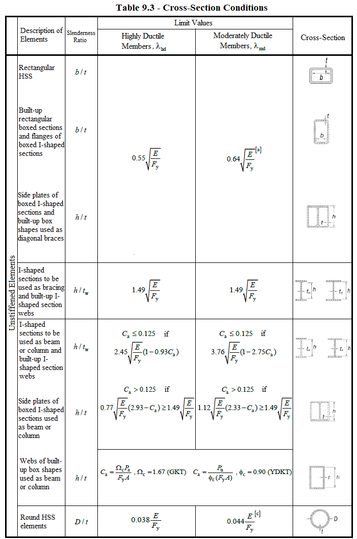 The cross-sections used for the columns and beams of the moment-resisting frames must not undergo local buckling and must be compact enough to provide certain ductility capacity. Thus, for the moderately ductile level limit values are higher.
