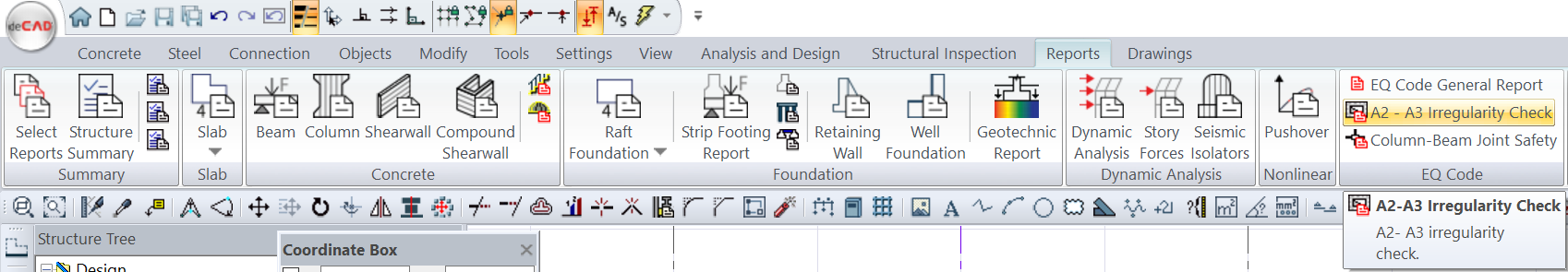 After selecting the line and axis, click the Report/Earthquake Regulation/A2-A3 Irregularity Check line.