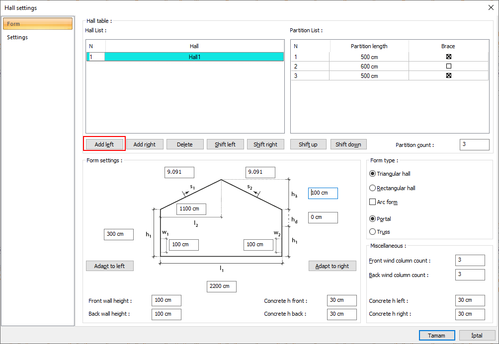 More than one hall is created in connection with each other with the add left button. While creating the first hall, the hall can be added, or it can be added by selecting the hall to be added next to it and entering its settings.
