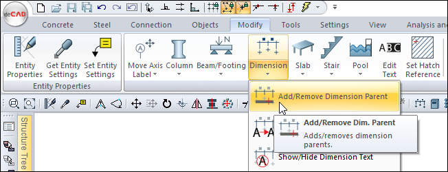 After clicking the right mouse button on the dimension, click the Add/Remove Dimension Parent line from the drop-down list or click the Add/Remove Dimension Paretn icon in the ribbon menu .