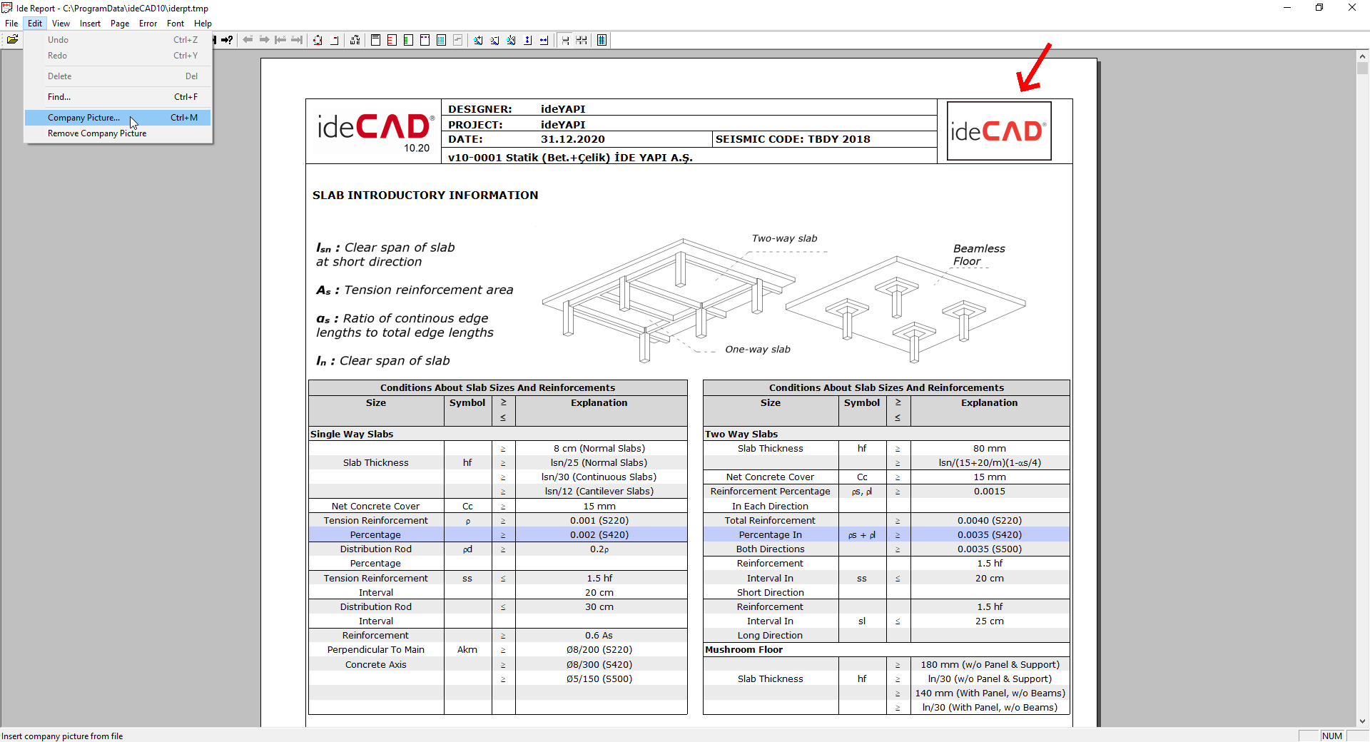 In ideReport, the company logo is added to the report with the "Edit/Company Picture" command.