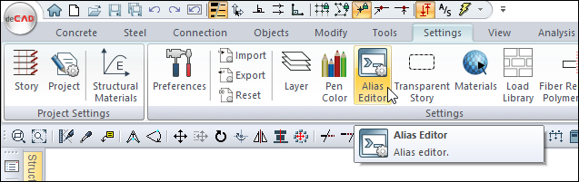 There are certain commands that can be written on the command line and are defined in the "idecadalias.txt file existing in the program folder. It is possible to access and make changes to these commands. When the Alias Editor icon is clicked, the commands and their shortcuts are listed in the Alias Editor dialog, and the shortcuts can be changed if wanted.
