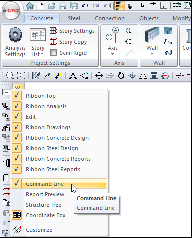 Commands can be run by clicking on the command line or typing commands from the keyboard. The command line can be closed or opened. It can be opened and closed by pressing the right button at any point on the edge of the vertical toolbar in the ribbon menu and clicking the Command Line line.