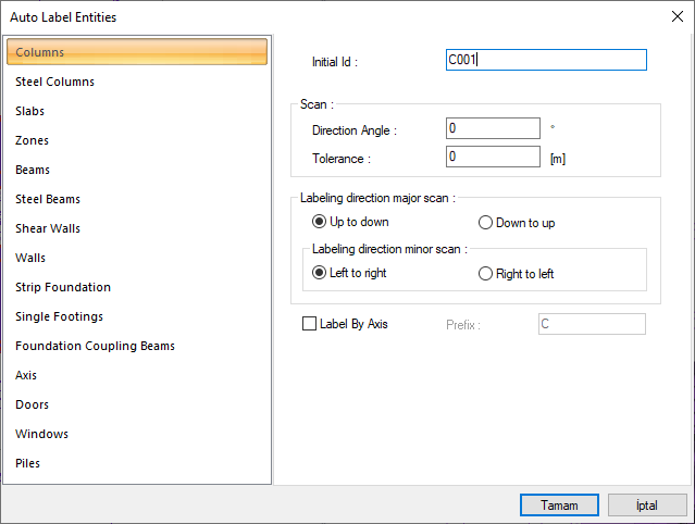 Label by axis ![]() With this option that is valid for columns, you can name the columns with the names of the axis passing through the column. For example, A and 1 axes are defined in the column. If the prefix S is given, the column is named SA1. |