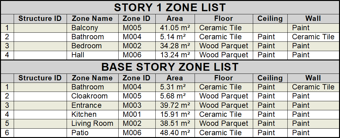 Structure ID, zone name, zone ID, area, floor, ceiling and wall features can be included in the list according to preference.