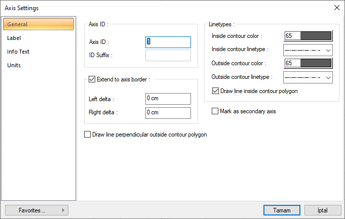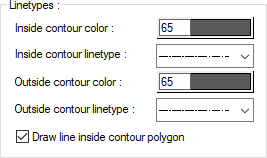 Linetypes ![]() Line types and line colors can be assigned separately for inside and outside the contour parts of the axis with the inside and outside line type parameters. If the "Draw line inside contour polygon" option is checked, the axis is drawn within the contour, with the inline contour type properties. Otherwise, the part of the axis within the contour is not drawn. |