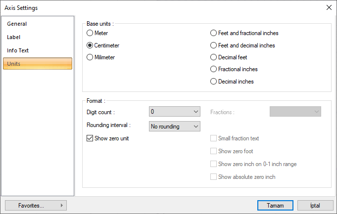 Fractions ![]() It determines the precision of the dimension to be made in fractional inch format. In the list, there are options with a sensitivity of 1/2, ¼, 1/8, 1/16, 1/32, 1/34. If "no fraction" is selected, units will appear without fractions. |