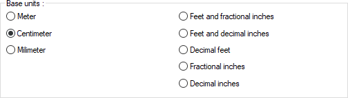 Basic units ![]() One of the selections is activated by clicking the left mouse button on the job. Meter : If checked, the unit of information text will be meters. |