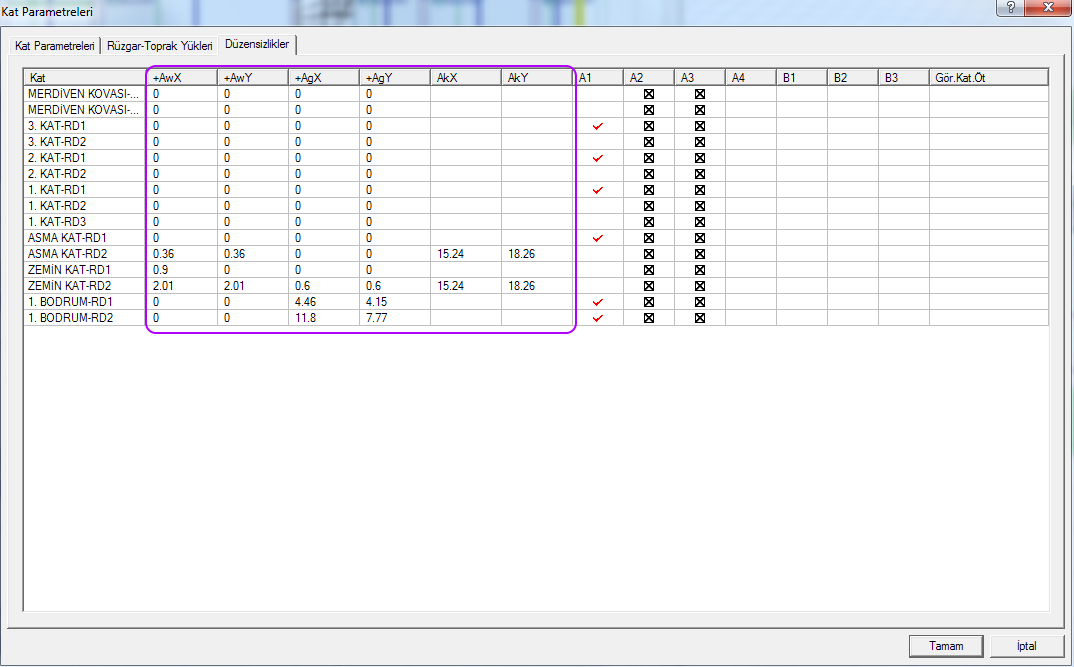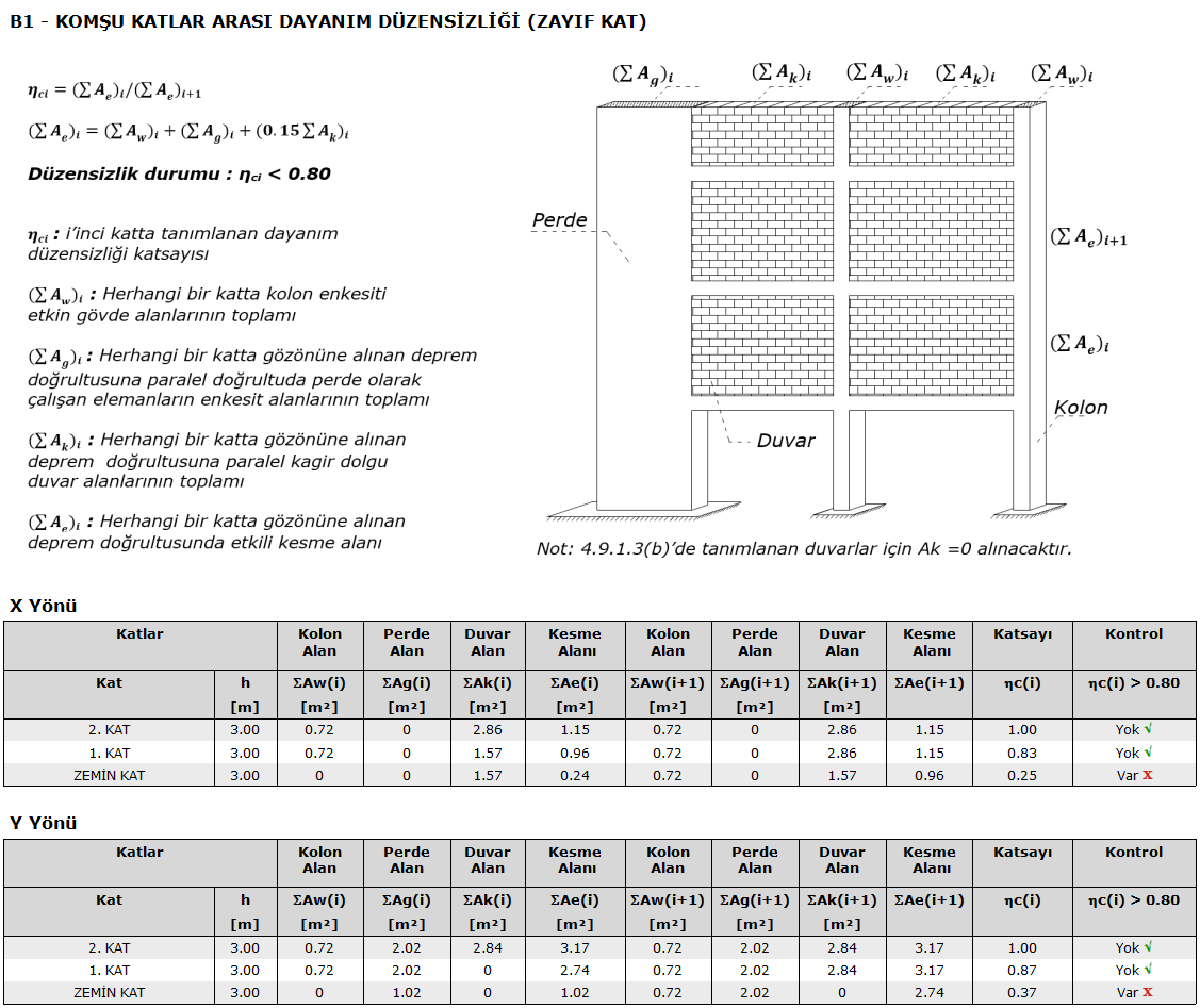 B1 - Strength Irregularity Between Neighboring Floors (Weak Floor) occurs when the effective cutting area of one floor is less than the value specified in the regulation when compared to an upper floor. The variables in the cutting area are curtain, column and walls (nth). Effective cutting areas are automatically calculated according to the load-bearing system and wall-wall loads entered in the program, and the values are printed in the general report of the earthquake regulation.