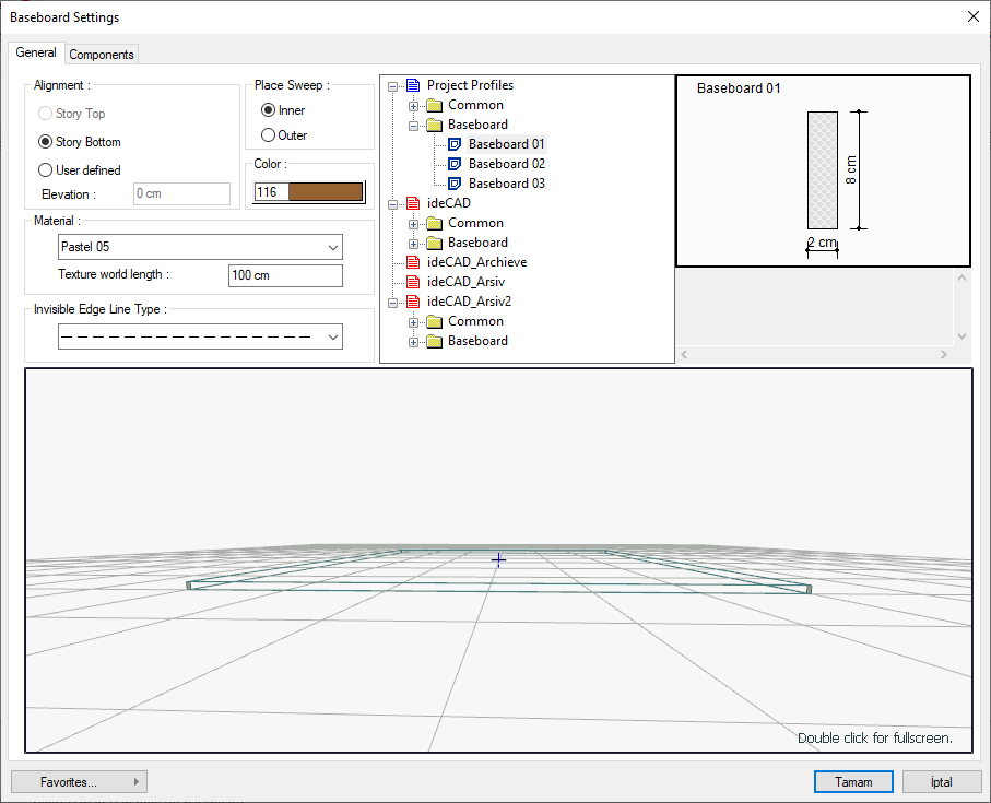 Color ![]() Select the color of the baseboard from the dialog that opens when clicked. |