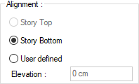 Alignment ![]() The position of the baseboard in the story is adjusted. If "Story top" is marked, the baseboard is placed on the story ceiling. If "User defined" is marked and the elevation is given, the baseboard is drawn according to the story floor, as high as the entered level. |