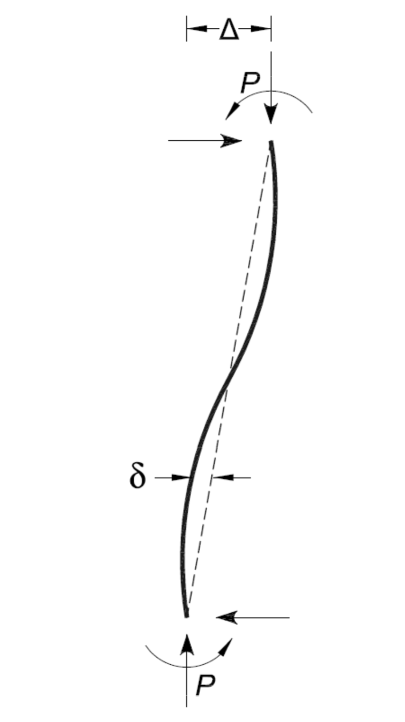 In the nonlinear analysis in terms of geometry, second-order effects arising due to axial forces occurring in structural elements are taken into consideration. Second order effects are divided into two as p-δ and p-Δ. The figure on the right is a representational representation of how p-δ and p-Δ effects occur in an element. The p-δ effect is caused by the axial pressure force on the element trying to increase the displacement caused by the curvature of the element itself. The p-Δ effect, on the other hand, creates additional moments in the element due to the axial pressure force due to the displacements of the joints of the element. p-Δ is explained in more detail in the image below.