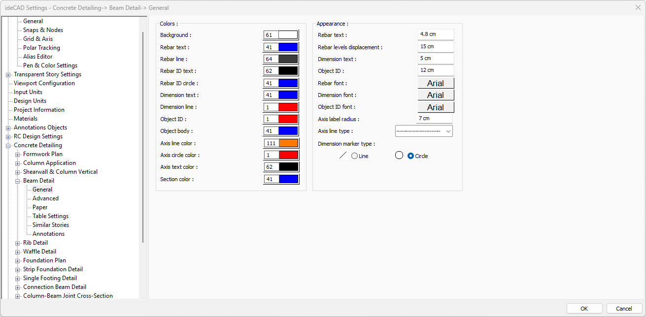 Rebar text ![]() Sets the color of the rebar text. When the color box is clicked, the appropriate color is selected from the window that opens. |