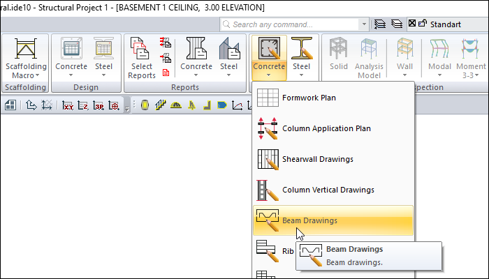 With the Beam Drawings command, the beam detail drawings of the project are prepared.