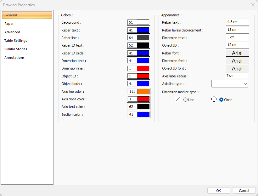 Rebar text ![]() Sets the color of the rebar text. When the color box is clicked, the appropriate color is selected from the window that opens. |