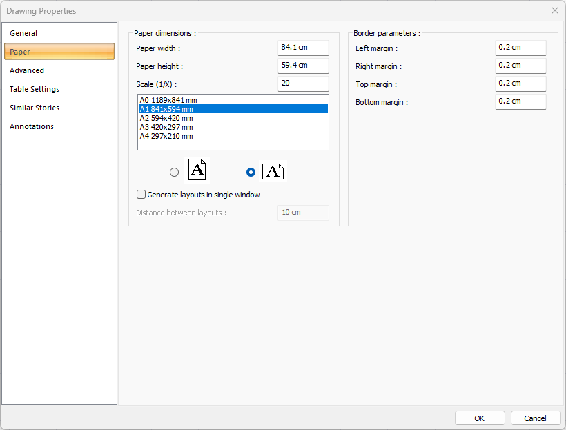 Standard paper sizes ![]() Standard paper sizes are listed. The layout size can be selected from the list, as well as the layout dimensions can be determined by entering the width and height values. |