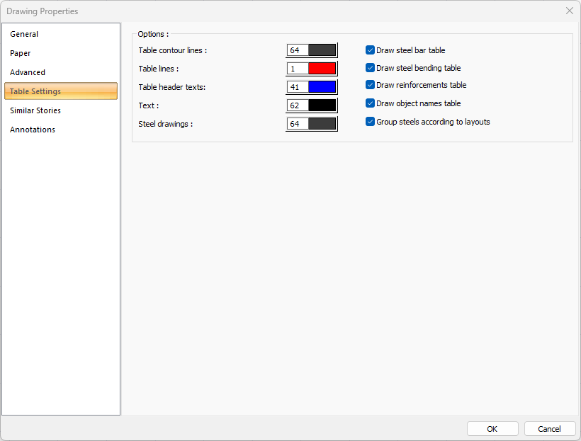 Group steels according to layouts ![]() If checked, the steels are grouped according to the layout and shown in the drawing. |