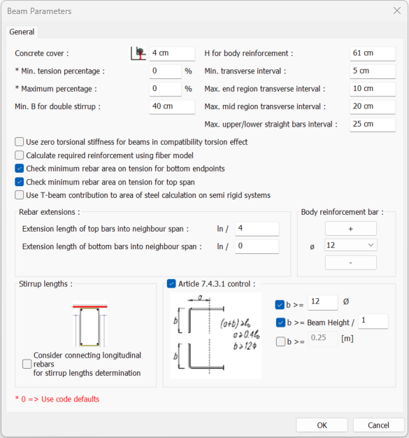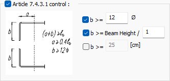 Article 7.4.3.1 control ![]() If TDY article 7.4.3.1 will be checked, this option is selected. With this control, the program checks the adequacy of the beam longitudinal rebars extended into the side columns. The minimum conditions are written in the diagram and can be changed if desired. |