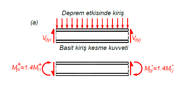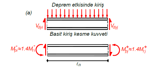 In this way, it is ensured that the power dissipation in the beam occurs with the ductile bending moment power depletion, instead of the brittle shear force power consumption. M pi and M pj are the positive or negative moment strength values calculated by considering the characteristic strength f ck of the concrete , the characteristic strength f yk of the reinforcement and the strength increase of the reinforcement , which are formed by taking into account the moment direction at the beam ends .