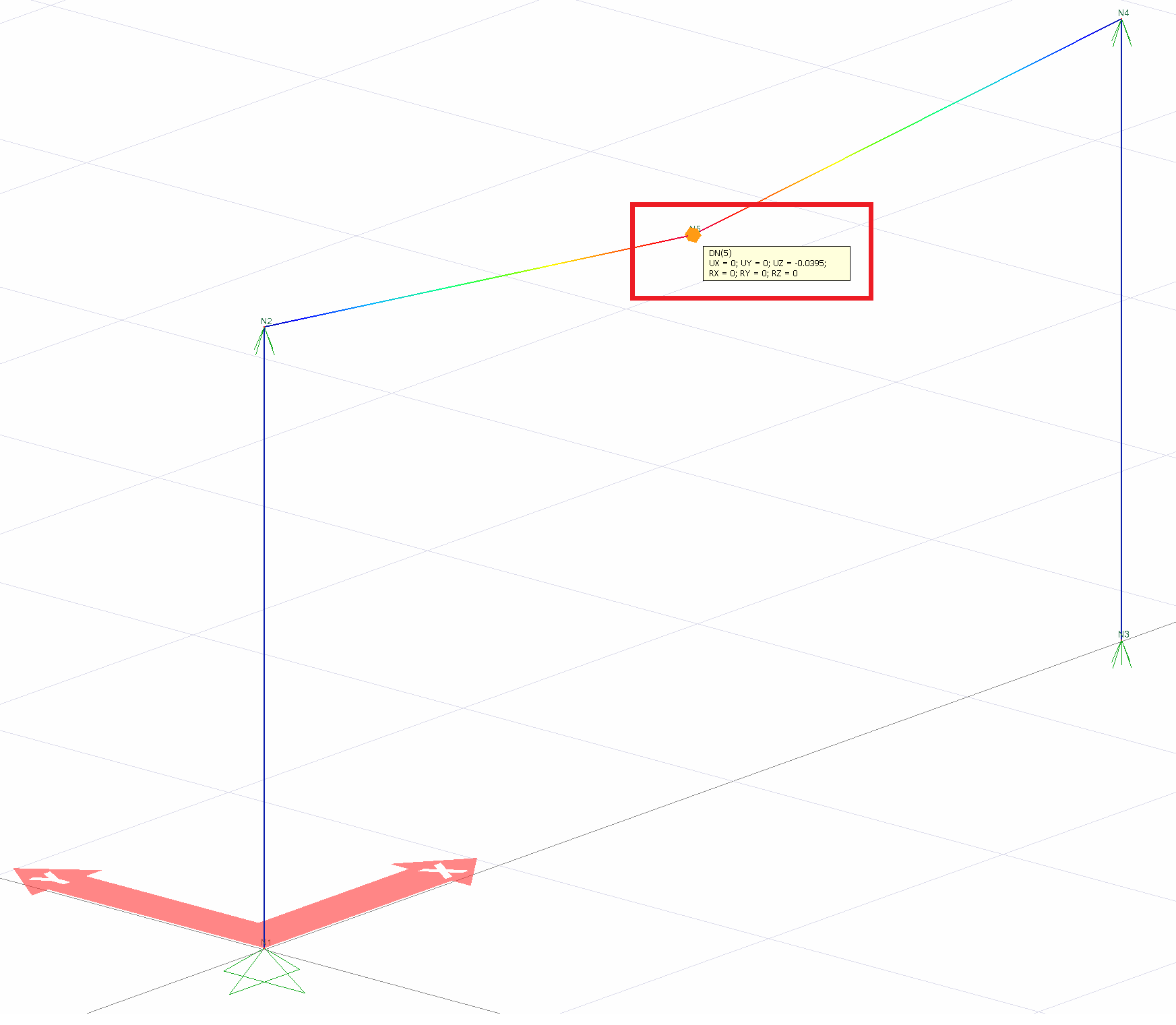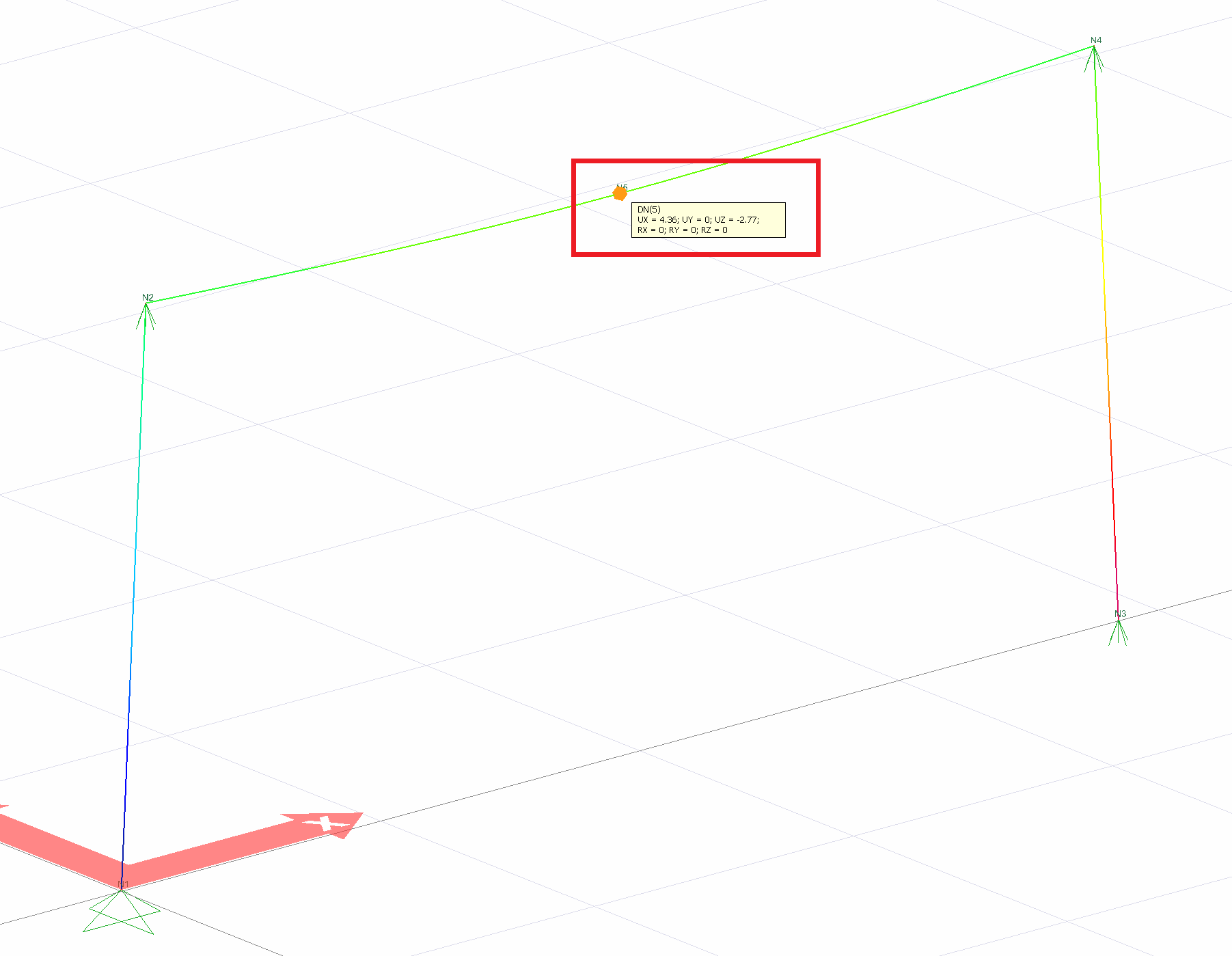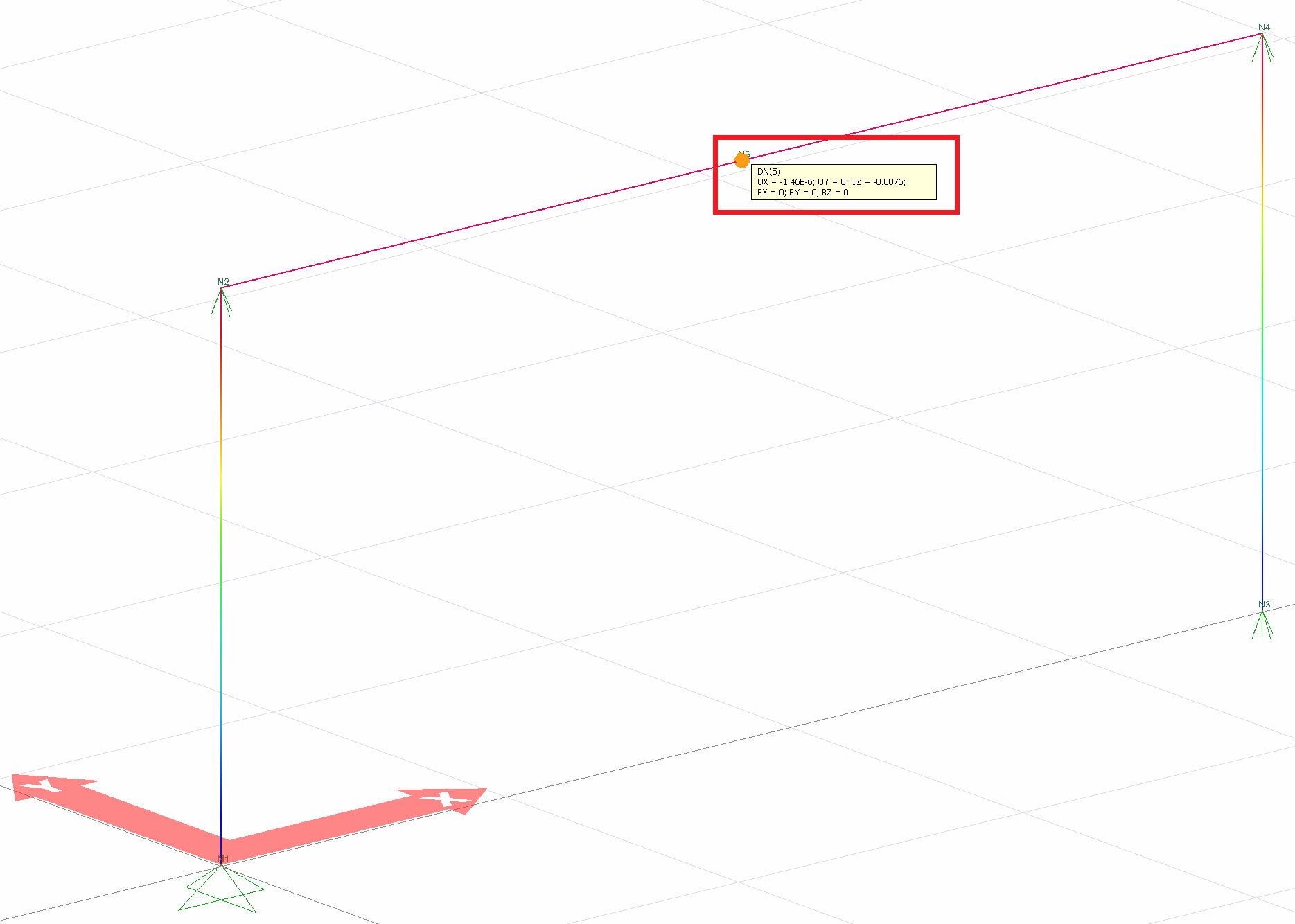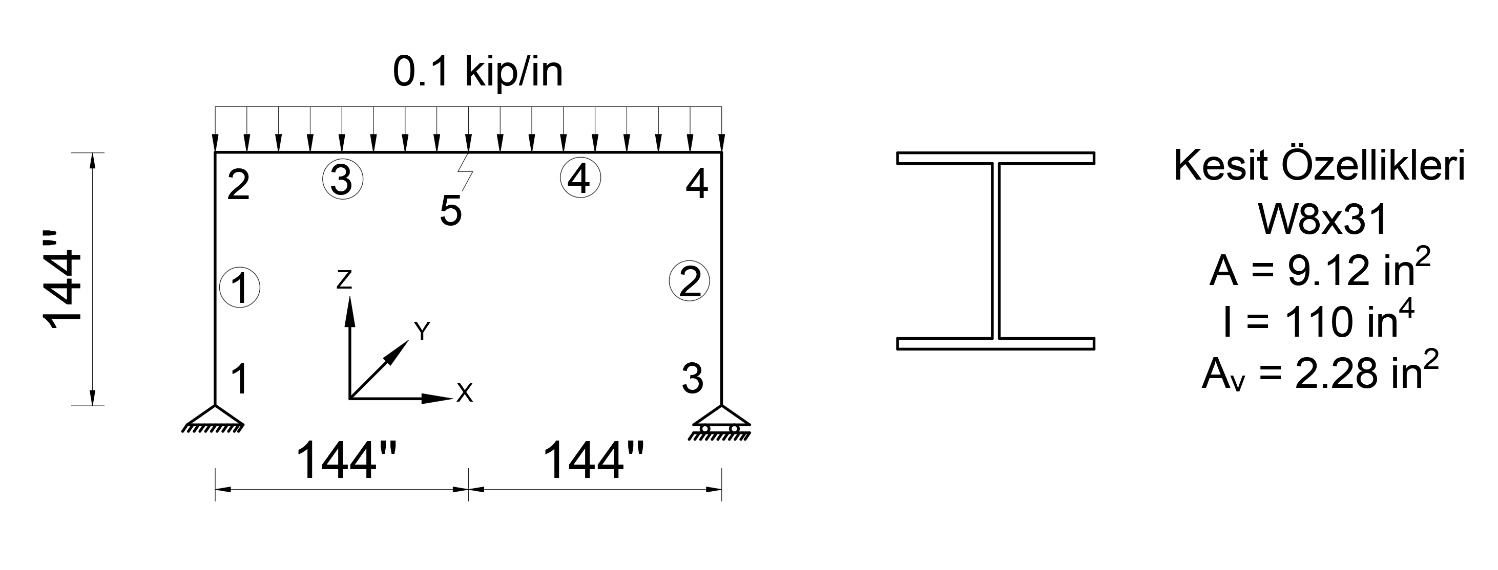 In the picture above, support conditions, joint numbers and loading status of a single storey system consisting of 4 rod elements are given. In this example, the deformation value (UZ) of joint 5 in the Z axis will be analyzed.